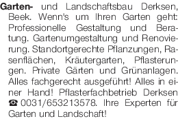 Garten- und Landschaftsbau Derksen, Beek. Wenn's um Ihren Garten geht: Professionelle Gestaltung und Beratung. Gartenumgestaltung und Renovierung. Standortgerechte Pflanzungen, Rasenflächen, Kräutergarten, Pflasterungen. Private Gärten und Grünanlagen. Alles fachgerecht ausgeführt! Alles in einer Hand! Pflasterfachbetrieb Derksen Tel. 0031/653213578. Ihre Experten für Garten und Landschaft!