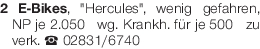 2 E-Bikes, "Hercules", wenig gefahren, NP je 2.050€ wg. Krankh. für je 500€ zu verk. Tel. 02831/6740Das könnte Sie auch interessieren