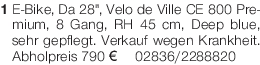 1 E-Bike, Da 28", Velo de Ville CE 800 Premium, 8 Gang, RH 45 cm, Deep blue, sehr gepflegt. Verkauf wegen Krankheit. Abholpreis 790 € Tel. 02836/2288820Das könnte Sie auch interessieren