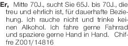 Er, Mitte 70J., sucht Sie 65J. bis 70J., die treu und ehrlich ist, für dauerhafte Beziehung. Ich rauche nicht und trinke keinen Alkohol. Ich fahre gerne Fahrrad und spaziere gerne Hand in Hand. Chiffre Chiffre Z001/14816Das könnte Sie auch interessieren