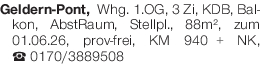 Geldern-Pont, Whg. 1.OG, 3 Zi, KDB, Balkon, AbstRaum, Stellpl., 88m², zum 01.06.26, prov-frei, KM 940€+ NK, Tel. 0170/3889508Das könnte Sie auch interessieren
