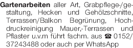 Gartenarbeiten aller Art, Grabpflege-/gestaltung, Hecken und Gehölzschnitte, Terrassen/Balkon Begrünung, Hochdruckreinigung Mauer,-Terrassen und Pflaster u.v.m führt fachm. aus Tel. 0152/37243488 oder auch per WhatsApp