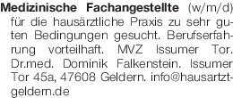 Medizinische Fachangestellte (w/m/d) für die hausärztliche Praxis zu sehr guten Bedingungen gesucht. Berufserfahrung vorteilhaft. MVZ Issumer Tor. Dr.med. Dominik Falkenstein. Issumer Tor 45a, 47608 Geldern. info@hausartzt-geldern.de