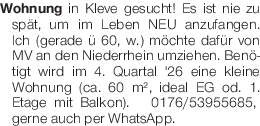 Wohnung in Kleve gesucht! Es ist nie zu spät, um im Leben NEU anzufangen. Ich (gerade ü 60, w.) möchte dafür von MV an den Niederrhein umziehen. Benötigt wird im 4. Quartal '26 eine kleine Wohnung (ca. 60 m², ideal EG od. 1. Etage mit Balkon). Tel. 0176/53955685, gerne auch per WhatsApp.