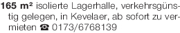 165 m² isolierte Lagerhalle, verkehrsgünstig gelegen, in Kevelaer, ab sofort zu vermieten Tel. 0173/6768139Kontakt