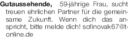 Gutaussehende, 59-jährige Frau, sucht treuen ehrlichen Partner für die gemeinsame Zukunft. Wenn dich das anspricht, bitte melde dich! sofinovak67@t-online.deDas könnte Sie auch interessieren