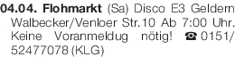 04.04. Flohmarkt (Sa) Disco E3 Geldern Walbecker/Venloer Str.10 Ab 7:00 Uhr. Keine Voranmeldug nötig! Tel. 0151/52477078 (KLG)