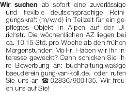 Wir suchen ab sofort eine zuverlässige und flexible deutschsprachige Reinigungskraft (m/w/d) in Teilzeit für ein gepflegtes Objekt in Alpen auf der Ulrichstr. Die wöchentlichen AZ liegen bei ca. 10-15 Std. pro Woche ab den frühen Morgenstunden Mo-Fr. Haben wir Ihr Interesse geweckt? Dann schicken Sie Ihre Bewerbung an: buchhaltung.wa@gebaeudereinigung-van-koll.de. oder rufen Sie uns an Tel. 02836/900135. Wir freuen uns auf Sie!Das könnte Sie auch interessieren