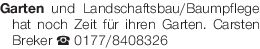 Garten und Landschaftsbau/Baumpflege hat noch Zeit für ihren Garten. Carsten Breker Tel. 0177/8408326Das könnte Sie auch interessieren