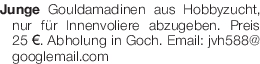 Junge Gouldamadinen aus Hobbyzucht, nur für Innenvoliere abzugeben. Preis 25 €. Abholung in Goch. Email: jvh588@googlemail.comDas könnte Sie auch interessieren