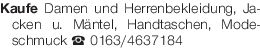 Kaufe Damen und Herrenbekleidung, Jacken u. Mäntel, Handtaschen, Modeschmuck Tel. 0163/4637184Das könnte Sie auch interessieren