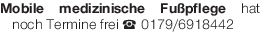 Mobile medizinische Fußpflege hat noch Termine frei Tel.0179/6918442Das könnte Sie auch interessieren
