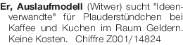 Er, Auslaufmodell (Witwer) sucht "Ideenverwandte" für Plauderstündchen bei Kaffee und Kuchen im Raum Geldern. Keine Kosten. Chiffre Chiffre Z001/14824Das könnte Sie auch interessieren