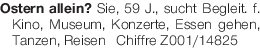 Ostern allein? Sie, 59 J., sucht Begleit. f. Kino, Museum, Konzerte, Essen gehen, Tanzen, Reisen Chiffre Chiffre Z001/14825