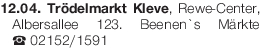 12.04. Trödelmarkt Kleve, Rewe-Center, Albersallee 123. Beenen`s Märkte Tel. 02152/1591Das könnte Sie auch interessieren