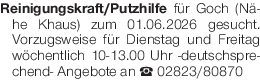 Reinigungskraft/Putzhilfe für Goch (Nähe Khaus) zum 01.06.2026 gesucht. Vorzugsweise für Dienstag und Freitag wöchentlich 10-13.00 Uhr -deutschsprechend- Angebote an Tel. 02823/80870Das könnte Sie auch interessieren