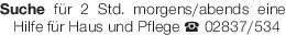 Suche für 2 Std. morgens/abends eine Hilfe für Haus und Pflege Tel. 02837/534Das könnte Sie auch interessieren